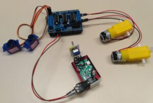 Preste atenção na polaridade do servo – o pino de controle (laranja) fica ‘para dentro’ da placa; o pino do GND (preto, ou, no meu exemplo, marrom), fica ‘para fora’ da placa. A alimentação foi fornecida por uma bateria de 3,7V ligada em um módulo carregador / step up integrado identificado pelo código J5019 – – veja como em https://tiaplicada.ufpr.br/wp-content/uploads/2024/08/usodomoduloj5019stepupcarregador.pdf.