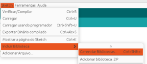 Para facilitar a programação, iremos utilizar uma biblioteca pronta, da Adafruit. Para instalar a biblioteca, no ambiente do Arduino clique em Sketch/ Incluir biblioteca / Gerenciar Bibliotecas (vamos ‘buscá-la’ na internet; se você já tiver o arquivo pode clicar em ‘Adicionar biblioteca .zip’):