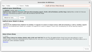 Na tela de gerenciamento de bibliotecas que se abrirá (pode demorar alguns instantes), vamos instalar a biblioteca ‘Adafruit Motor Shield library’: