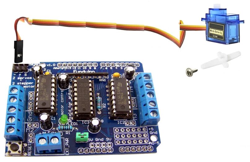 (pode usar qualquer uma das duas ligações de servo motor, depois ajuste o código, mudando o valor da variável PinoServoMotor – pela ligação elétrica do módulo, os pinos disponíveis são os digitais 9 e o 10).