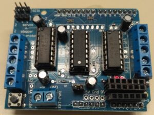 Do Inglês, shield quer dizer escudo; no ambiente do Arduino chamamos de shield queles módulos que podem ser encaixados sobre a placa do Arduino. Os mais comuns são aqueles voltados ao Arduino UNO. O que utilizaremos é composto de dois controladores LD293 e um registrador de deslocamento 74HC795. Ele é capaz de controlar 4 motores DC ou 2 motores de passo. E também 2 servo motores. Os circuitos integrados são instalados em soquetes, de forma que podem ser retirados para experiências e circuitos individuais.