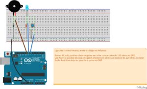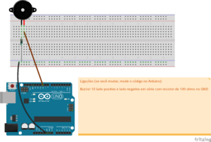 Nesta terceira etapa, deixamos ligado o buzzer, que está conectado no pino 10 (lado positivo) e no GND (lado negativo) em série com um resistor de 100 ohms.
