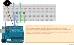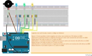 Nesta segunda etapa, deixamos ligado o buzzer, que está conectado no pino 10 (lado positivo) e no GND (lado negativo) em série com um resistor de 100 ohms.