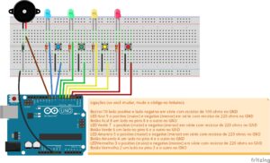 Resumidamente ele sorteia luzes em uma sequência aleatória; depois, você tem que repetir a sequência. Se você acertar a sequência ele toca a música de ‘acerto’ e, se você errar, a de ‘erro’.